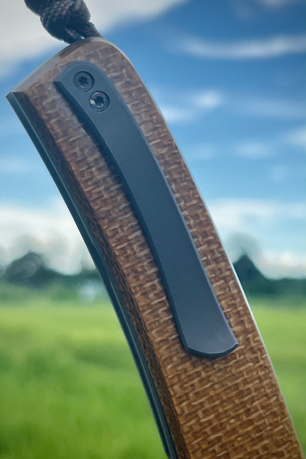 Manche: côtes en vieux Micarta, platines titane, fausse pièce carbone, clip de poche titane