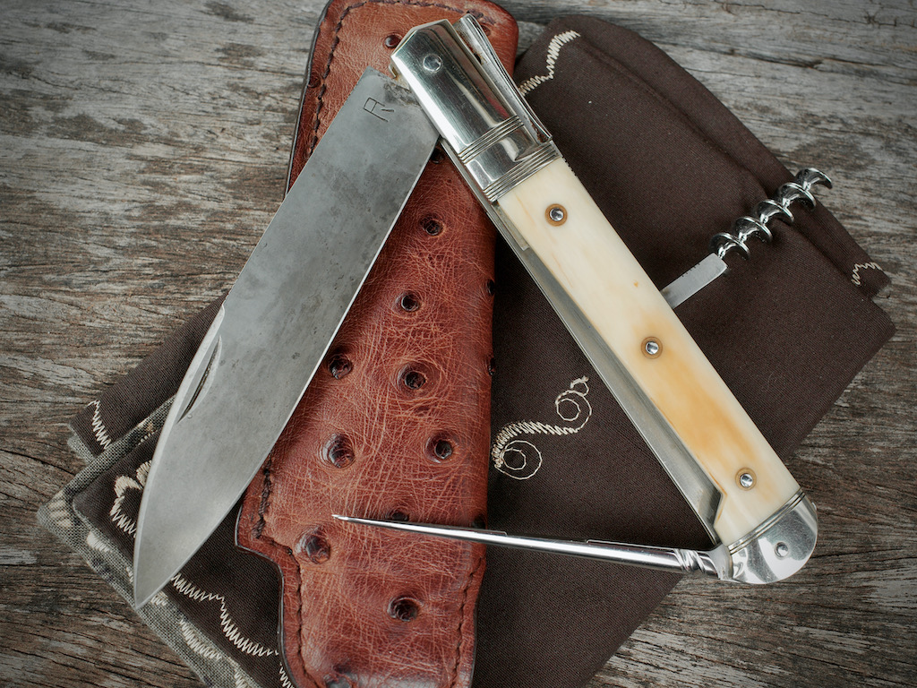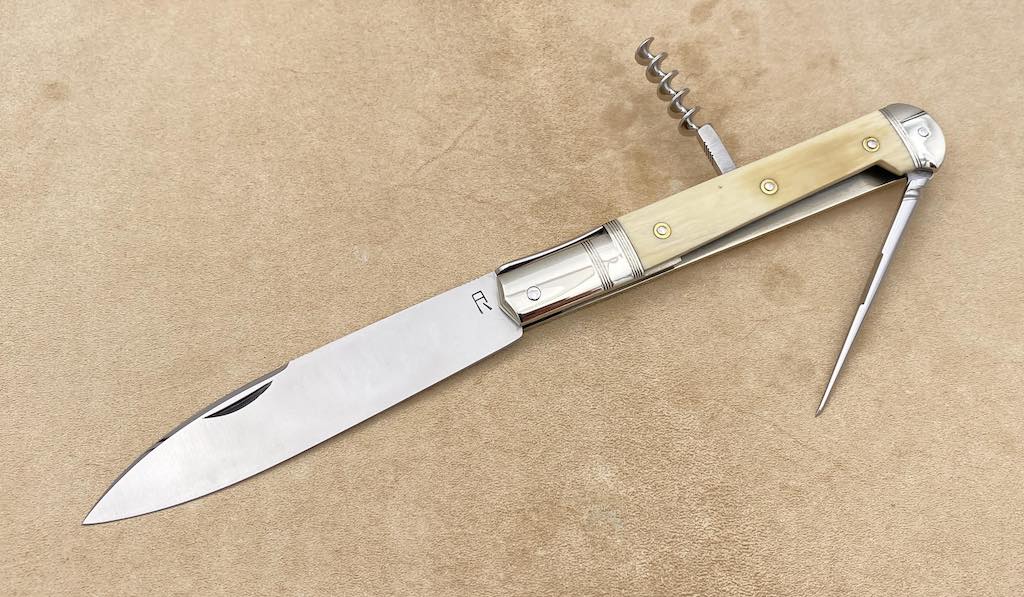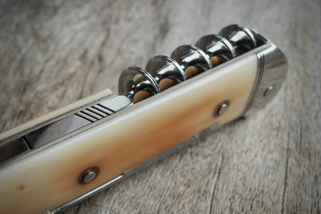 Derniers mots pour terminer cette présentation, parlons de la mécanique et notamment du cran forcé pour la lame. Mais au fait, savez vous que le cran forcé est vraiment un truc typiquement français, différent du cran plat anglo-saxon par exemple ? À tel point, j’ai remarqué que nos talentueux couteliers qui exportent outre atlantique ne savent pas du coup comment le nommer pour leurs clients américains… On voit souvent passer du « French notch » par exemple ! Bref, ici ce French notch est évidemment parfait, cela va sans dire et j’ai presque oublié d’en parler. La tension du ressort est idéale, c’est un plaisir à chaque ouverture/fermeture du couteau. Et pour compléter ce paragraphe de La Palice, l’action du tire-bouchon et du poinçon est tout aussi exceptionnelle.