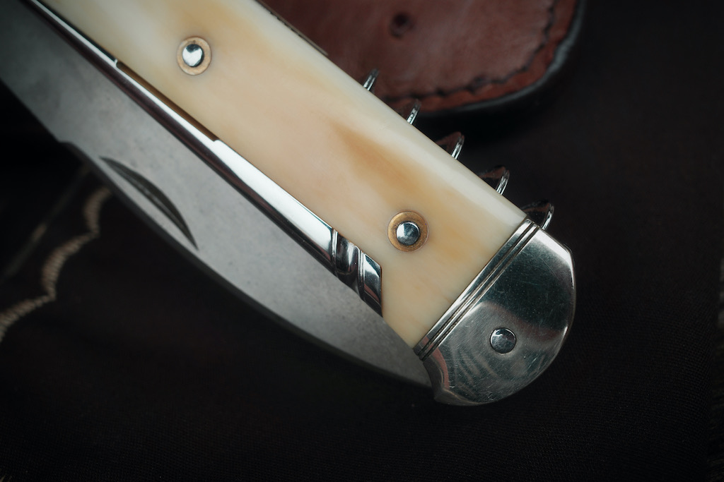 Autrement, j’ai fait le choix du Maillechort pour les mitres et platines car j’adore cet alliage qui a une consonnance de temps passés et anciens. Pis le rendu est vraiment unique avec cette brillance qui rappelle l’Argent fraichement poli, mais brillance qui reste contrairement à l’Argent, le Maillechort ne terni pas avec le temps. C’est vraiment l’alliage qui colle le mieux à l’image d’un couteau traditionnel pour moi.