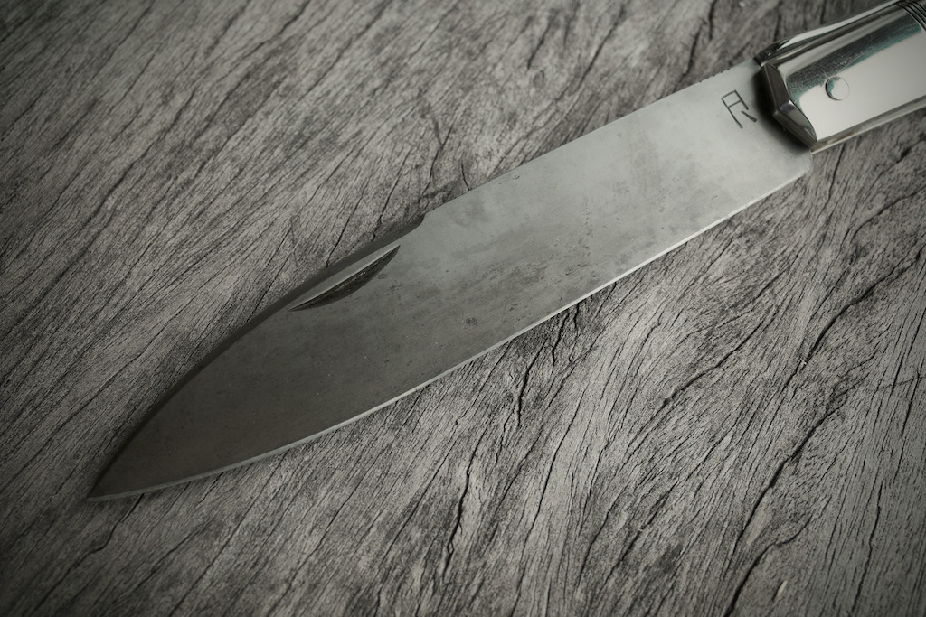 Cette lame en 130Cr3 a pris une patine assez uniforme qui me plait beaucoup. Je n’ai pas vu souvent des couteaux avec lame en 130Cr3 pourtant un excellent acier. Il a une dureté proche du C130 donc un acier très dur pour un tranchant qui se conserve longtemps, mais pourtant à l’expérience vraiment pas difficile à affuter comparé à certains inox US. D’autre part, il prend cette jolie patine mais sera moins sensible à la rouille que le C130 grâce au Chrome. Bref, j’avais choisi cet acier pour essai et je valide à 100% ce choix.