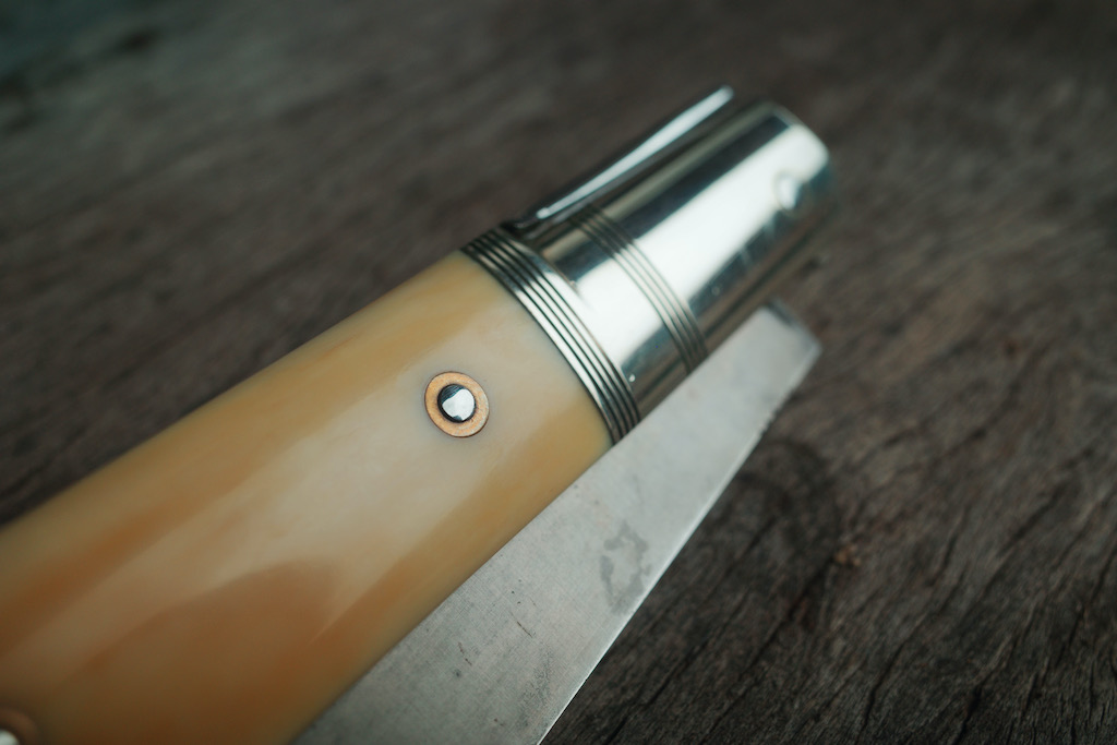 Maintenant les plaquettes, comme visible sur toutes les précédentes photo, un superbe ivoire de mammouth allant du blanc crème à quelques reflets jaunes/orangés, c’est la pulpe de l’ivoire : la matière interne qui a été protégée des aleas du temps (puisqu’on parle de la période géologique jusqu’à 2,6 millions d’années en arrière) par la partie externe de la défense, la croute. Arch, certains parlent d’un effet de mode pour cette matière… perso lorsqu’elle habille un couteau de cette qualité je trouve qu’il n’y a pas mieux ! Car en plus de l’aspect esthétique que j’adore et qui rappelle l’ivoire des très vieux couteaux régionaux, le touché, la douceur du matériau est un vrai délice…