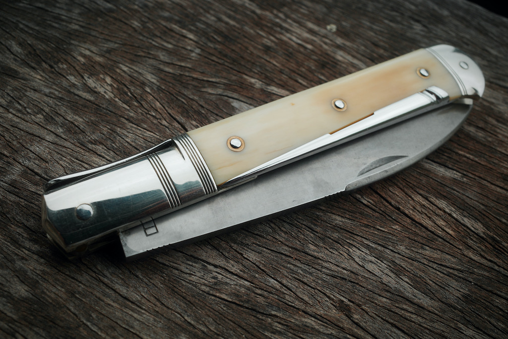 Vous noterez au passage le superbe bizeau sur la mitre avant, typique du modèle Issoire et le différenciant d’un Yssingeau par exemple, et cette mouche elle aussi typique au couteau à la forme si parfaite.