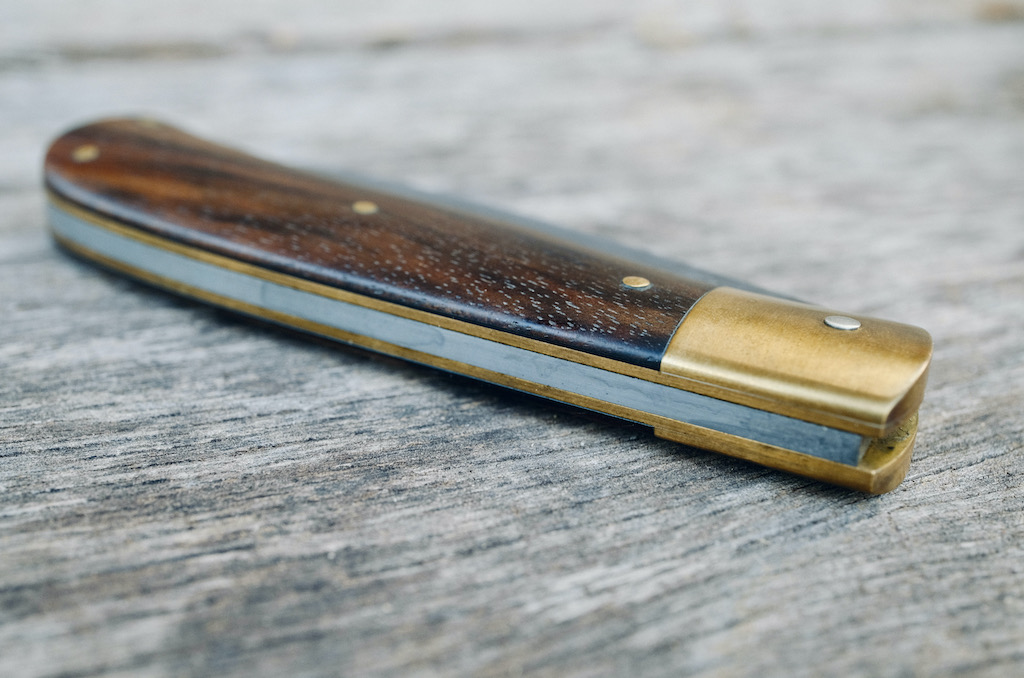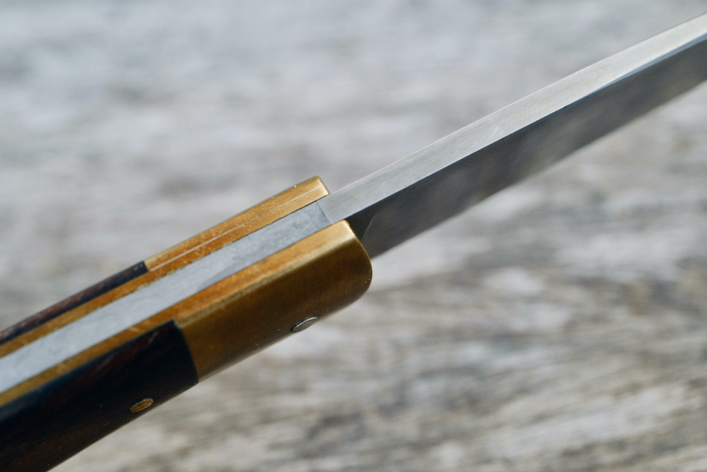 Laiton, Bronze, comme visible sur la photo d’entête j’adore ! Et c’est lorsque ces alliages patinent avec le temps qu’ils prennent toute leur valeur : une valeur non pas pécunière comme l’or mais celle encore bien plus précieuse car celle du partage de mon vécu ! Alors comme le couteau n’est plus neuf après ce long délai, les photos qui suivent devraient bien illustrer ce ressenti.